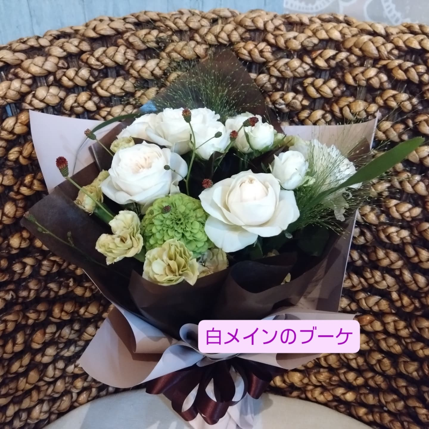 アンティークな色合いの花束アートフラワーアレンジのの彩です🌸花束は白系でのご注文ちょうどあったバラ[ジリアン]がほんのりピンクがかっていてアンティークな色合いの仕上がりに😊ウエディングブーケの…